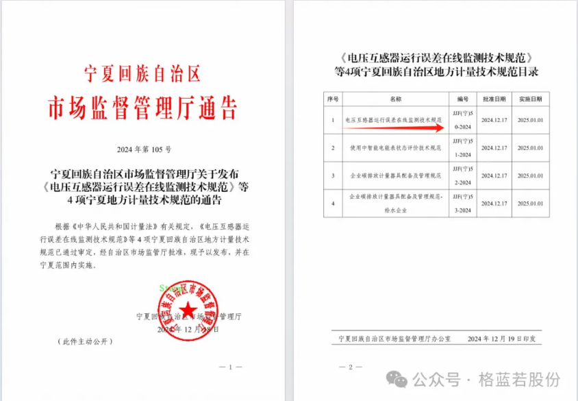寧夏回族自治區(qū)地方監(jiān)測(cè)技術(shù)規(guī)范《電壓互感器運(yùn)行誤差在線監(jiān)測(cè)技術(shù)規(guī)范》,經(jīng)寧夏回族自治區(qū)市場(chǎng)監(jiān)管局批準(zhǔn)發(fā)布,自2025年1月1日起執(zhí)行。格藍(lán)若股份為主要參與起草單位。